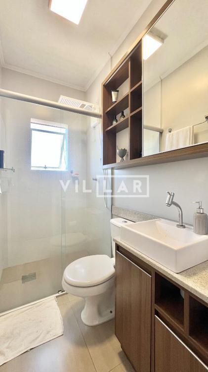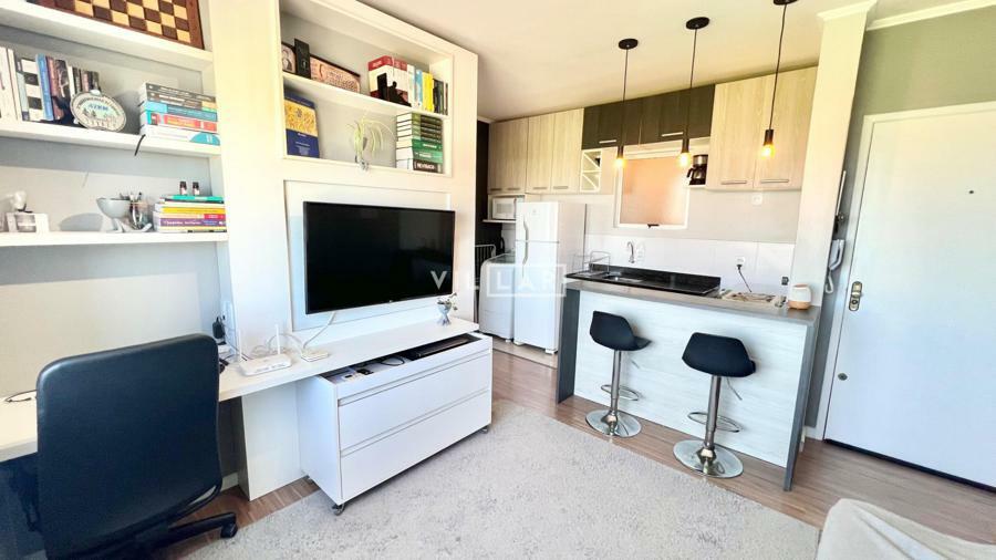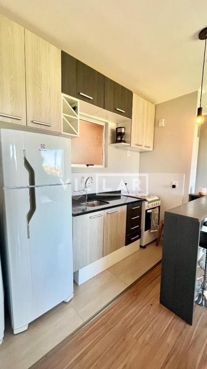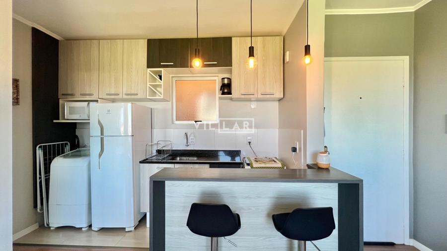 Imóvel semi-mobiliado com móveis planejados (Painel da sala de estar, cozinha e banheiro), possui piso laminado nos apartamento.