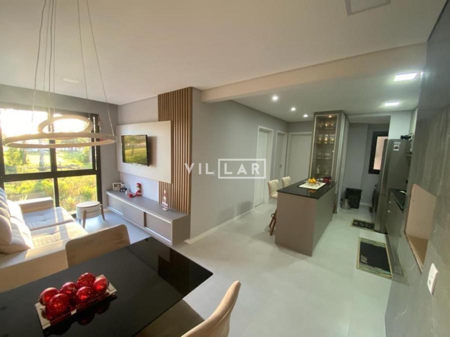 Apartamento mobiliado com móveis planejados. Com 02 dormitórios, banheiro social, área de serviço, cozinha americana com churrasqueira, estar e jantar e vaga de garagem.