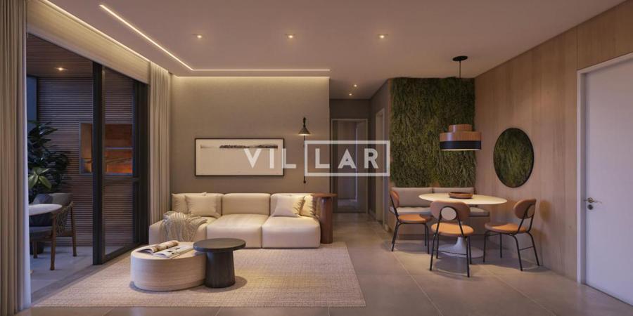 Apartamento com 69,87 m2, com sala de estar/ jantar com cozinha integrada, sacada com churrasqueira, 02 dormitórios, sendo 01 suíte e vaga de garagem.