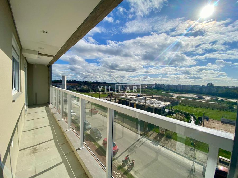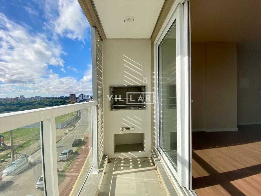 Sala de estar e jantar com espera para lareira, cozinha americana, área de serviço, sacada com churrasqueira, banheiro social, 03 dormitórios sendo 01 suíte e 1 vaga de garagem coberta.