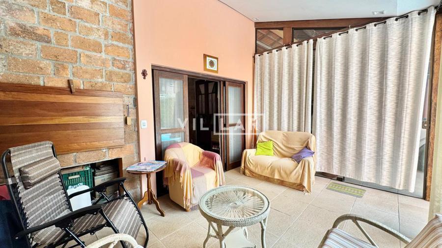 Sala de vidro virada para o pátio com churrasqueira