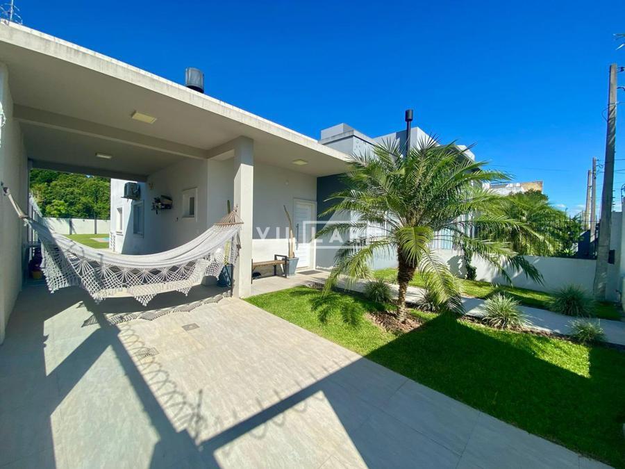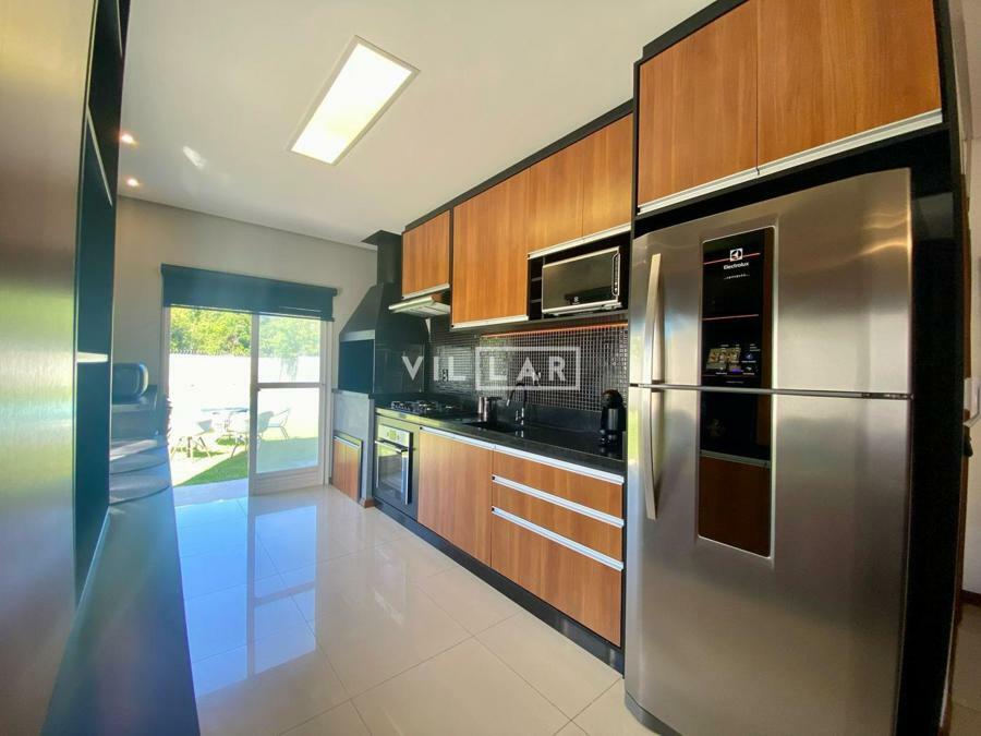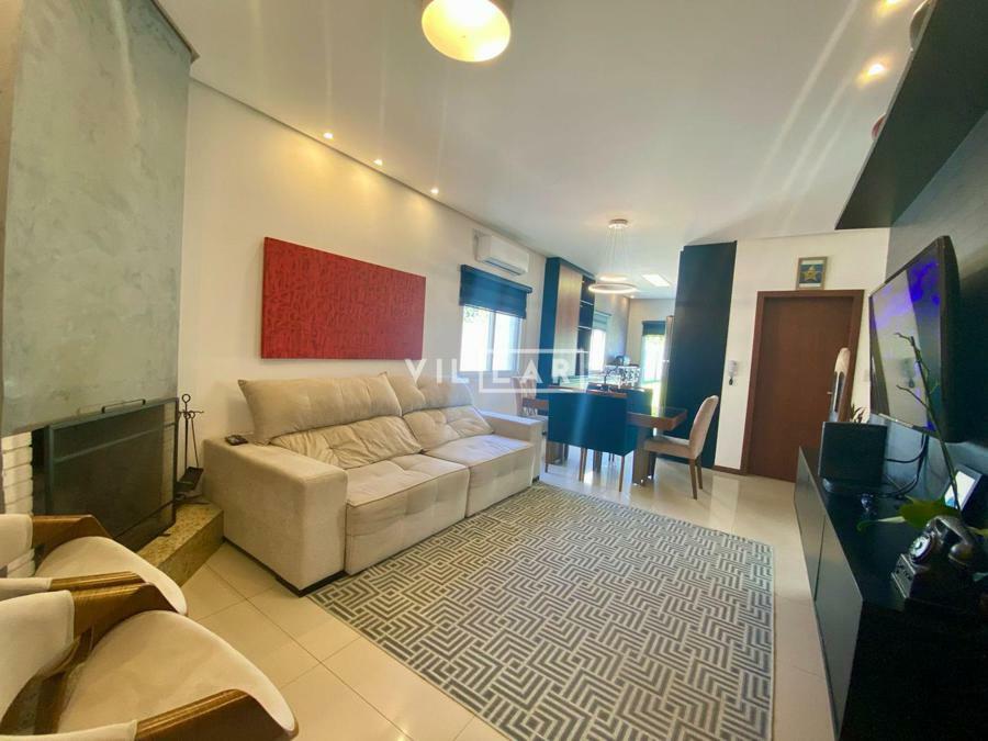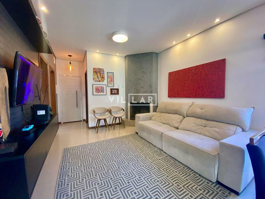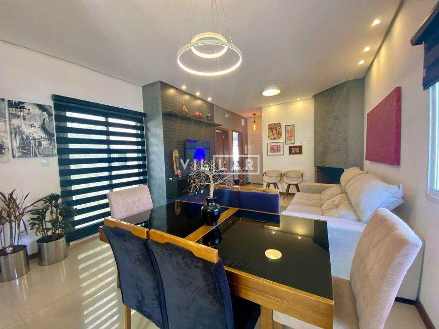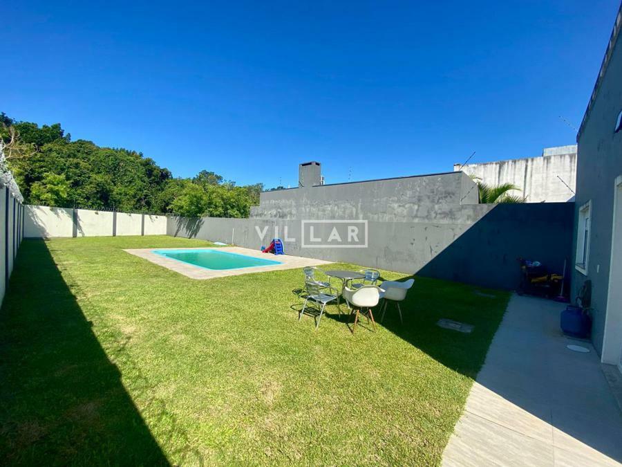 Sala de estar e jantar com lareira, banheiro social, área de luz, cozinha, 03 dormitórios sendo 01 suíte, amplo pátio com piscina e estacionamento para 4 carros.