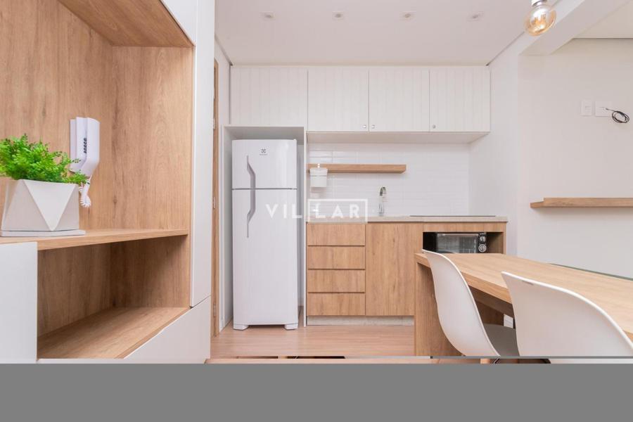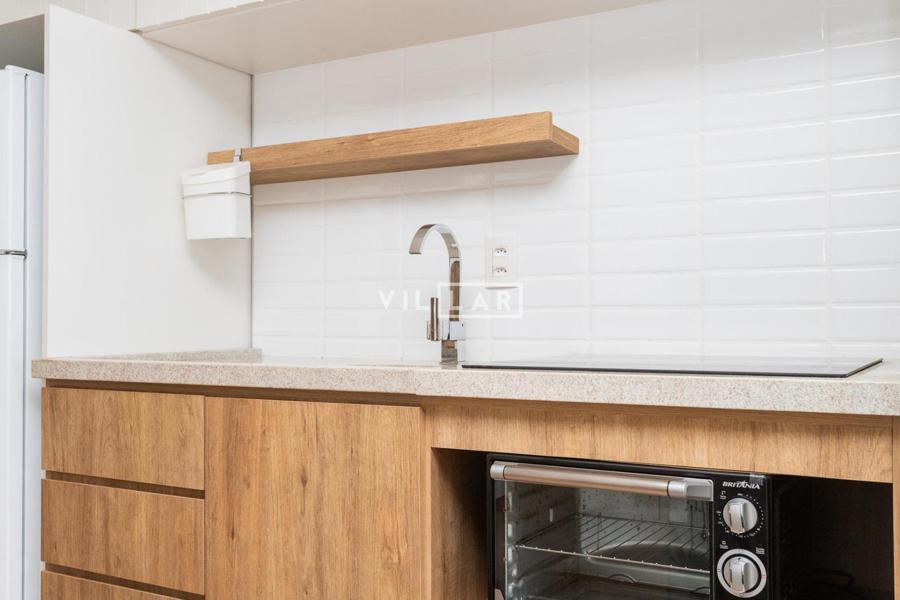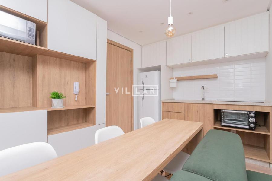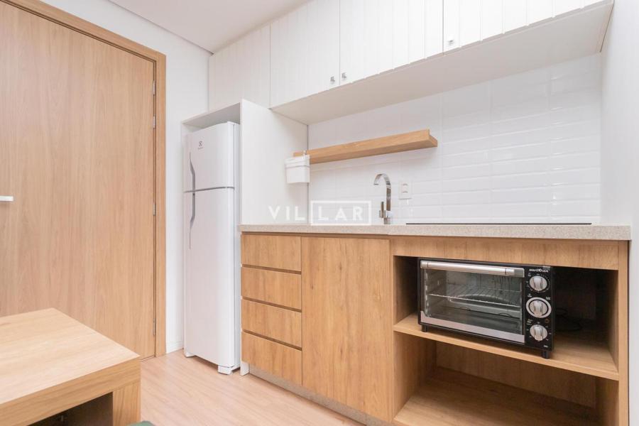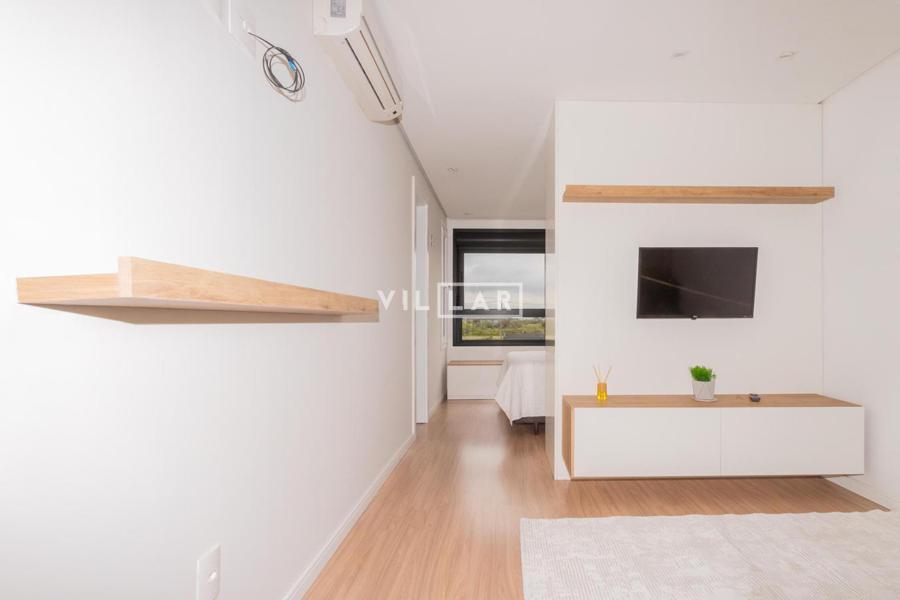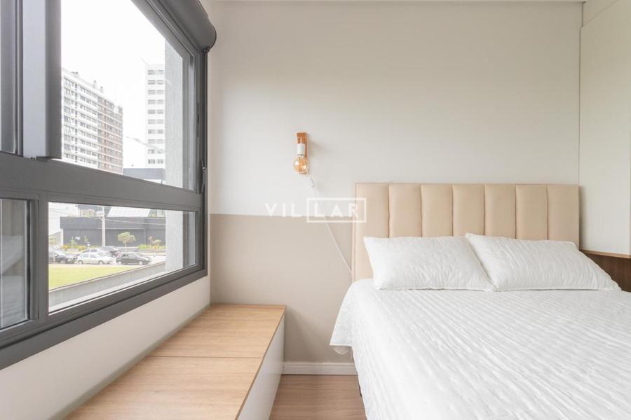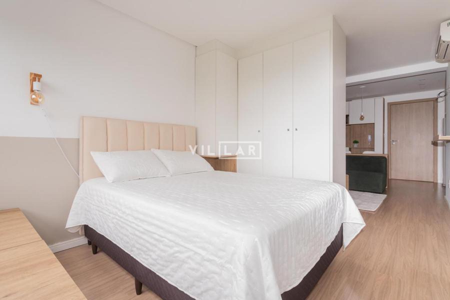 Studio prolongado com banheiro decorado e mobiliado, com vaga de garagem, vista privilegiada e pronto para morar.